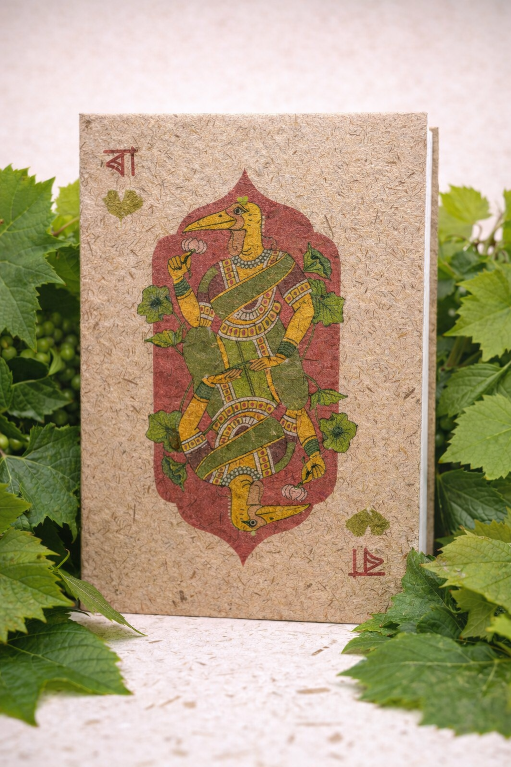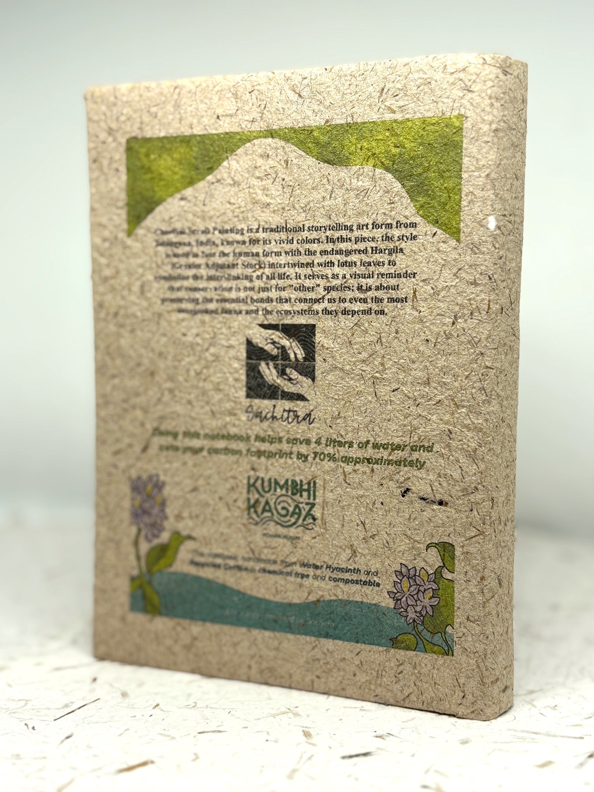 The Hardcover Notebook is made from water hyacinth, an invasive plant that is creatively repurposed to create sustainable and eco-friendly paper products. The pages of the notebook are also made from water hyacinth paper, giving it a unique and environmentally friendly touch.
